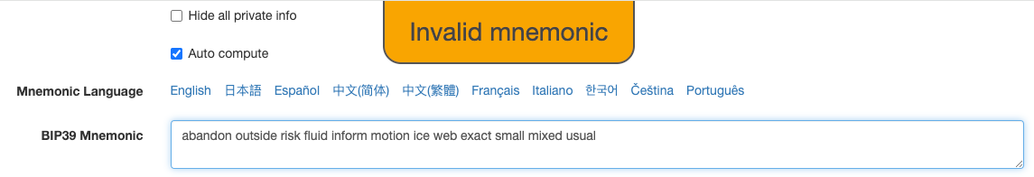 The BIP39 tool quickly gives us the message "Invalid mnemonic"
